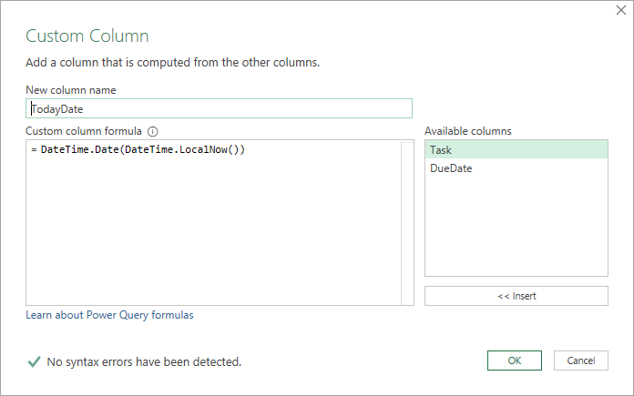 - Enter the text ‘TodayDate’ on the ‘New column name’ box.